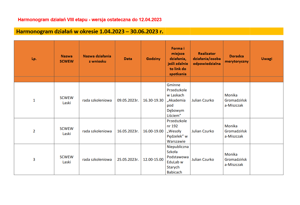 Harmonogram działań SCWEW Laski w okresie 1.04.2023 – 30.06.2023 r.